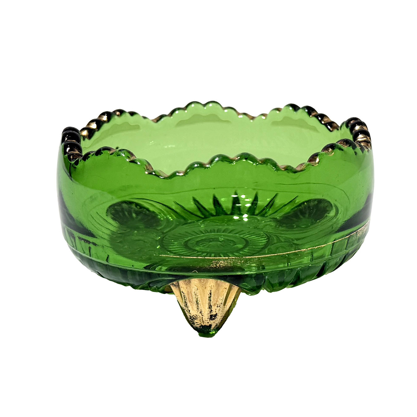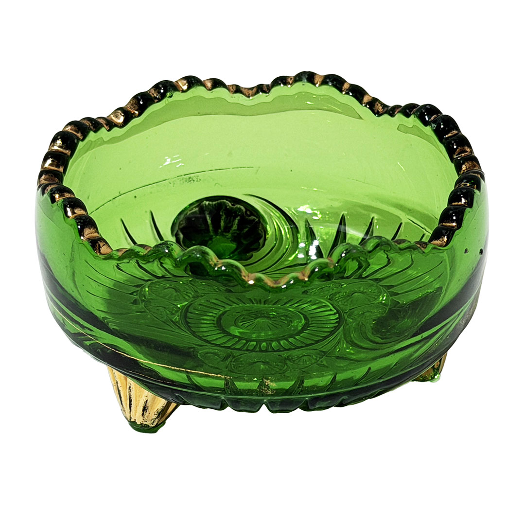 - Color: This EAPG Sauce Dish in the Esther Pattern is Emerald Green glass with gold accents.