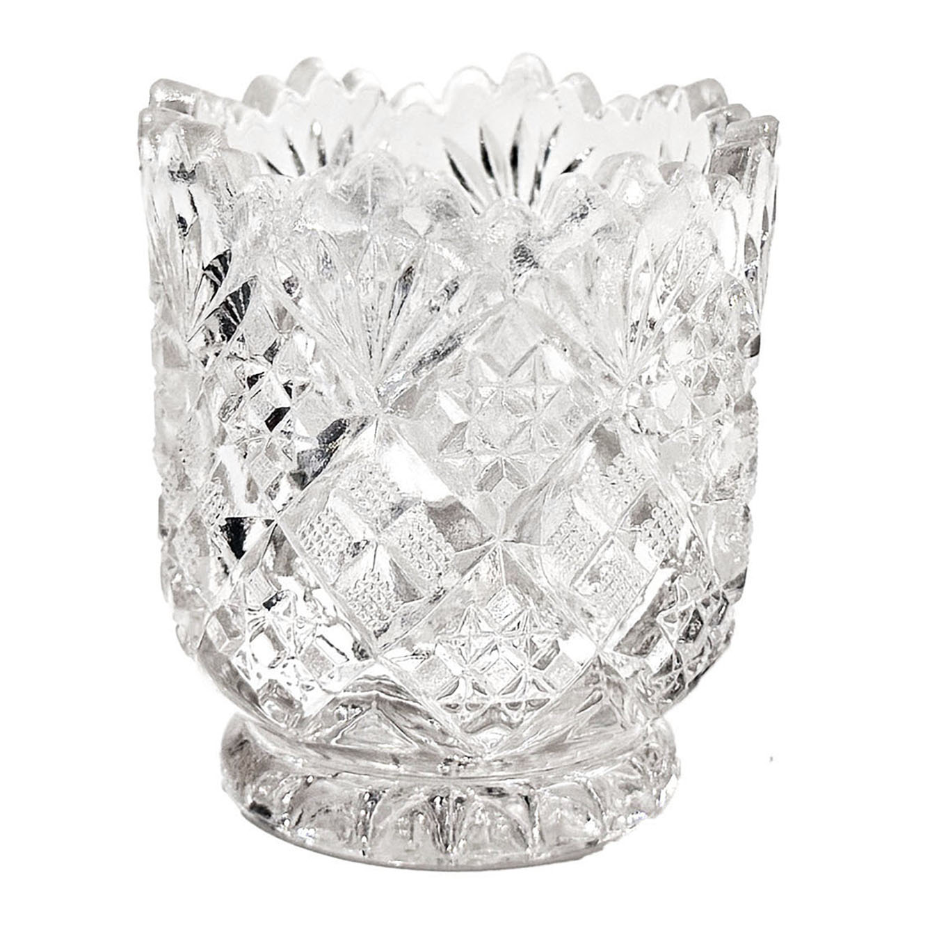 - Color: This EAPG toothpick holder in the Thumbelina pattern is crystal glass.