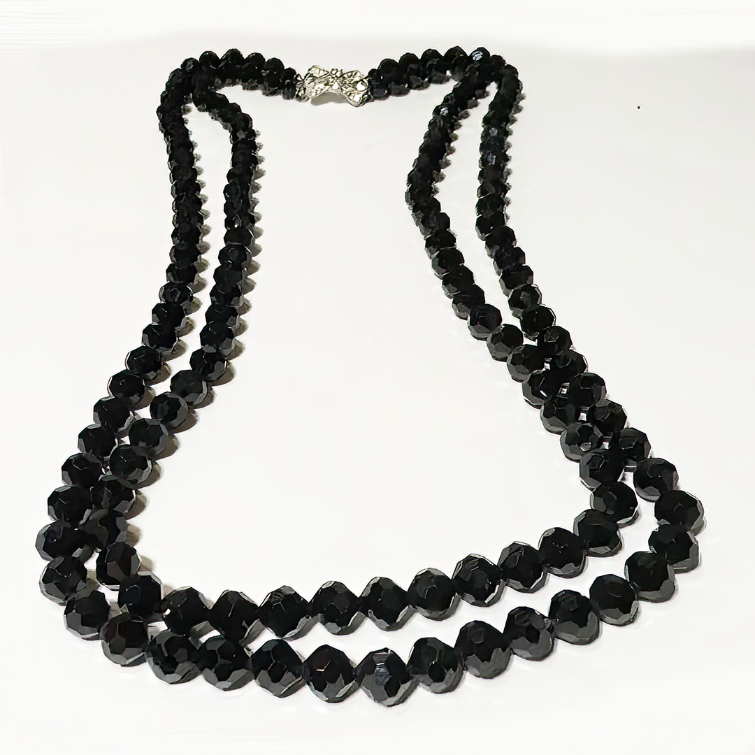 : Antique Black Glass Bead Necklace, often called jet, double strands, beautiful closure with 2 large teardrop rhinestones, 2 smaller rhinestones, and many tiny rhinestones