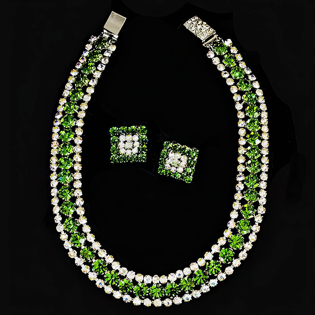 Featured is a wonderful Antique Emerald and Crystal Rhinestone Choker Necklace and Earrings Set.