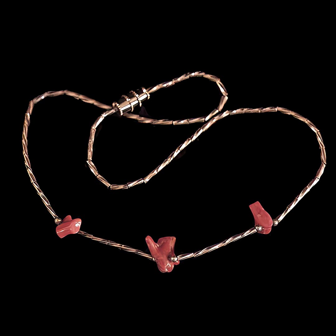 Featured is a wonderful Vintage Sterling Silver Bead Link Chain with Red Coral Handcrafted Necklace.