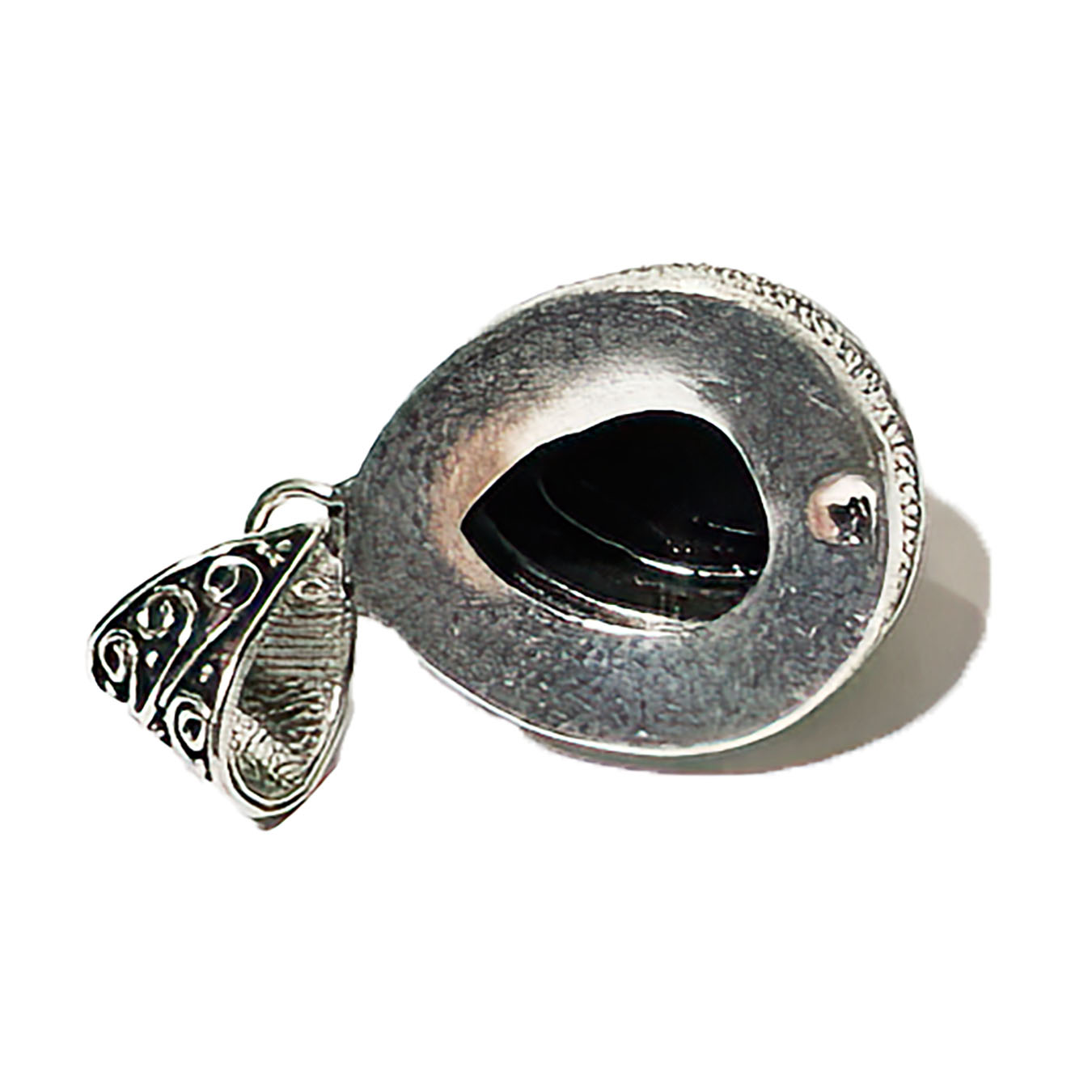 Item: Sterling Silver Onyx Teardrop Stone, very fancy silver bezel with scroll and rope design, can be hung on any size chain Size: 1 ¼ inches in length, 1 inch wide Circa: modern Company: handcrafted, 925 mark Condition: used, minimal signs of age and wear